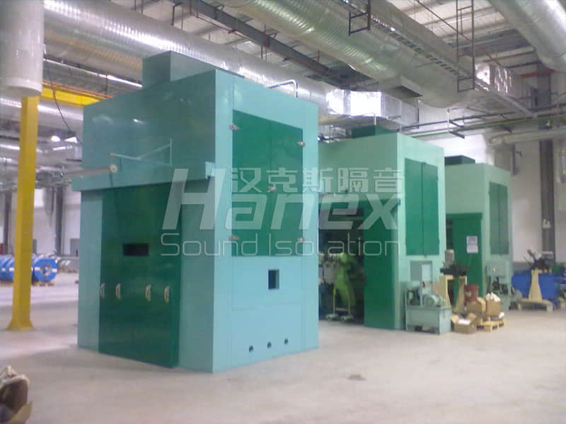 案例簡介:廠區(qū)車間內(nèi)有三臺沖床,用于生產(chǎn)汽車零配件,單臺沖床運作時噪聲值在96dB(A),影響較大。漢克斯隔音對三臺沖床分別增設了隔聲罩后,在隔聲罩1米處量的噪聲值為76dB(A)(單臺)。隔聲罩內(nèi)設有通風散熱等性能,不影響設備本身使用。